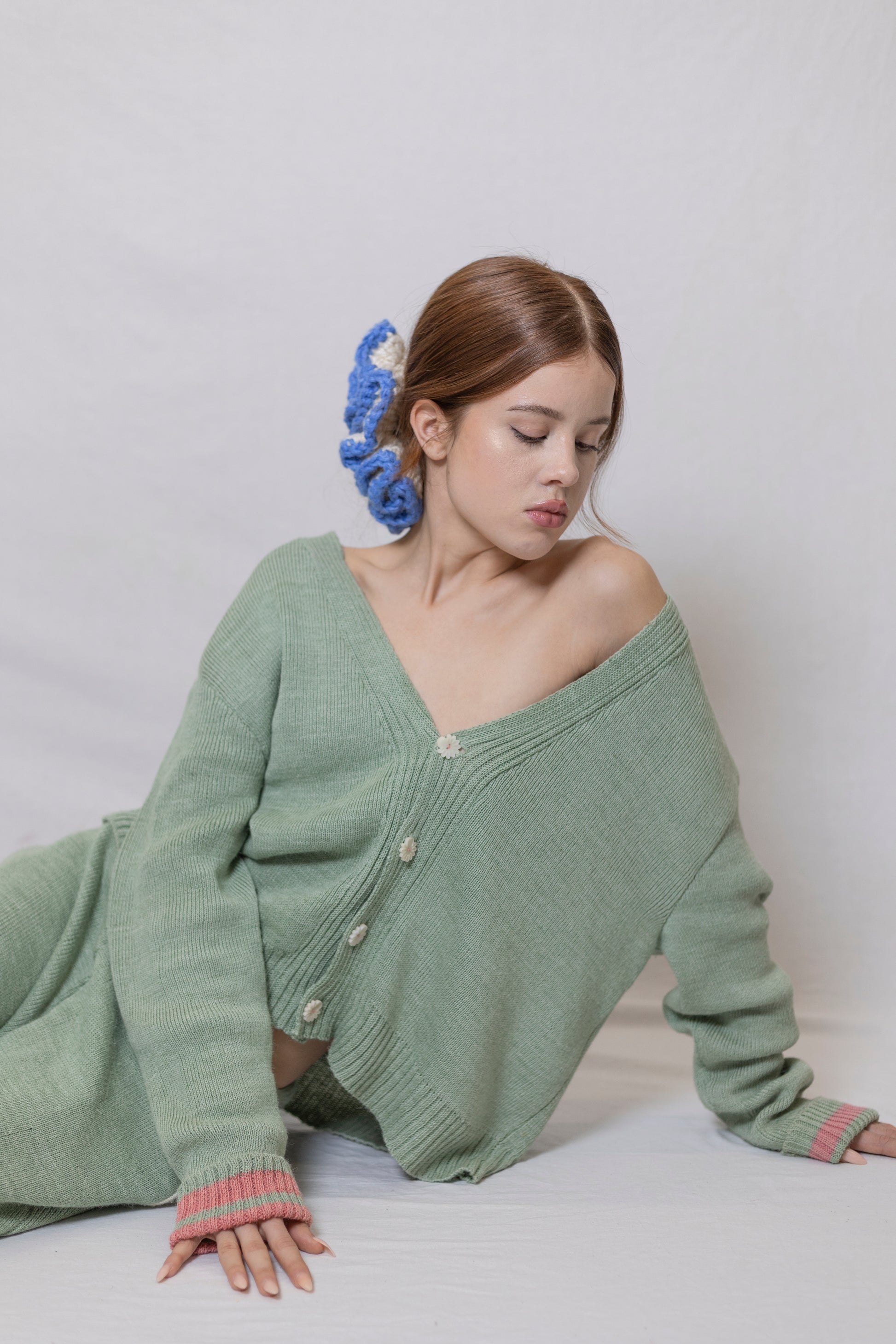 This scrunchie is hand-crocheted from a premium mix of regenerative merino wool from the French Alps and Himalayan nettle provided by a Nepalese social enterprise. Dyed with GOTS-certified colors.