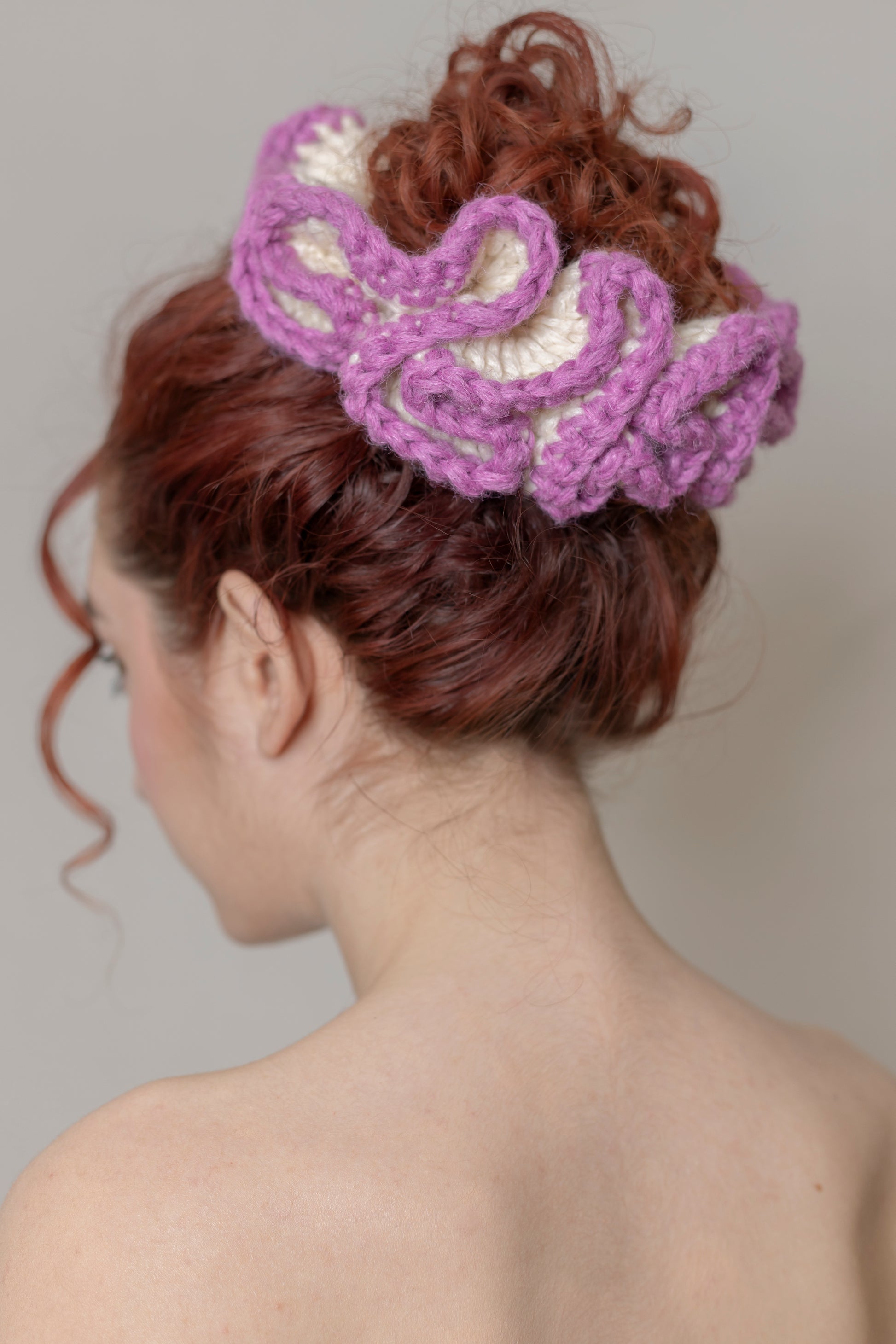 This scrunchie is hand-crocheted from a premium mix of regenerative merino wool from the French Alps and Himalayan nettle provided by a Nepalese social enterprise. Dyed with GOTS-certified colors.