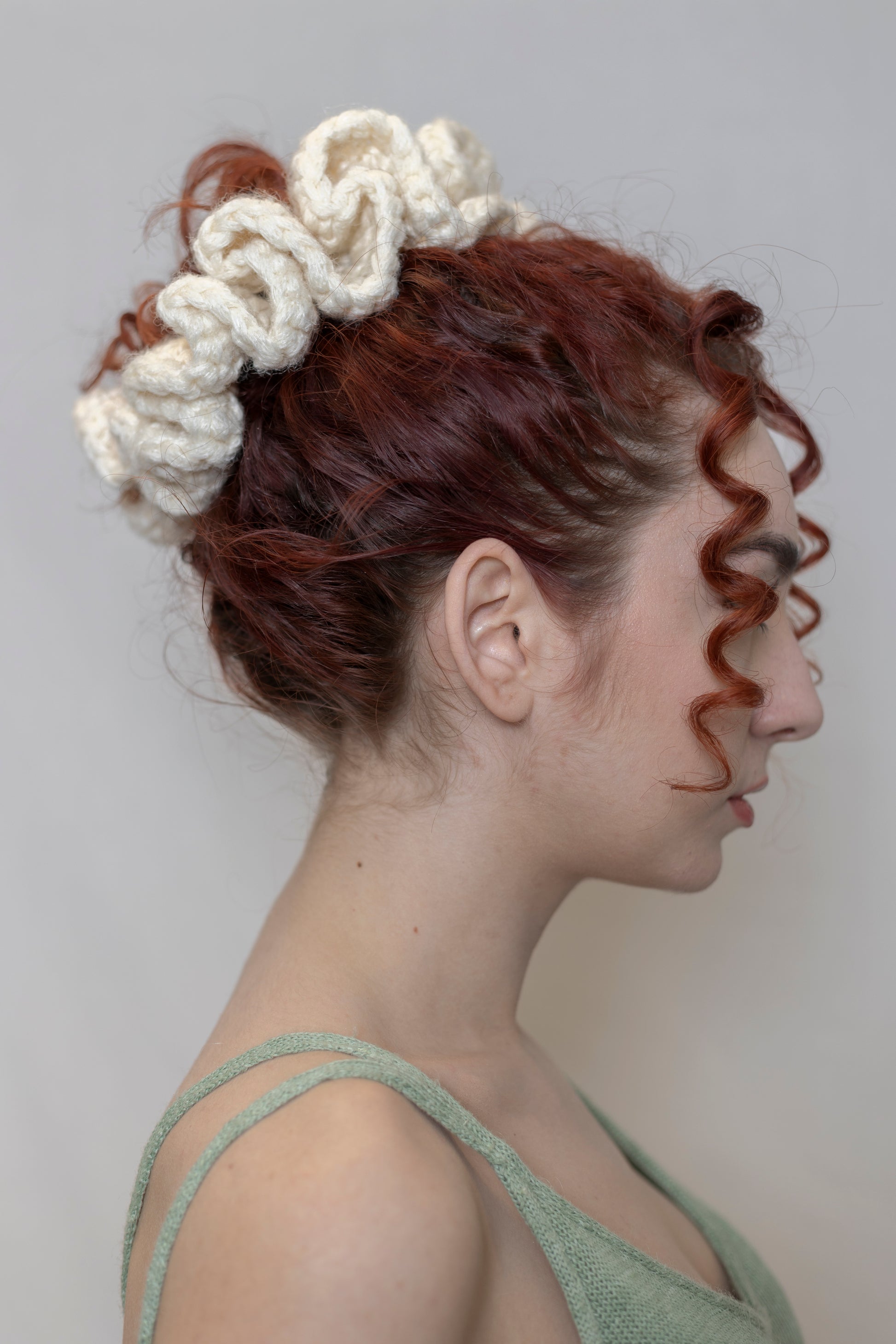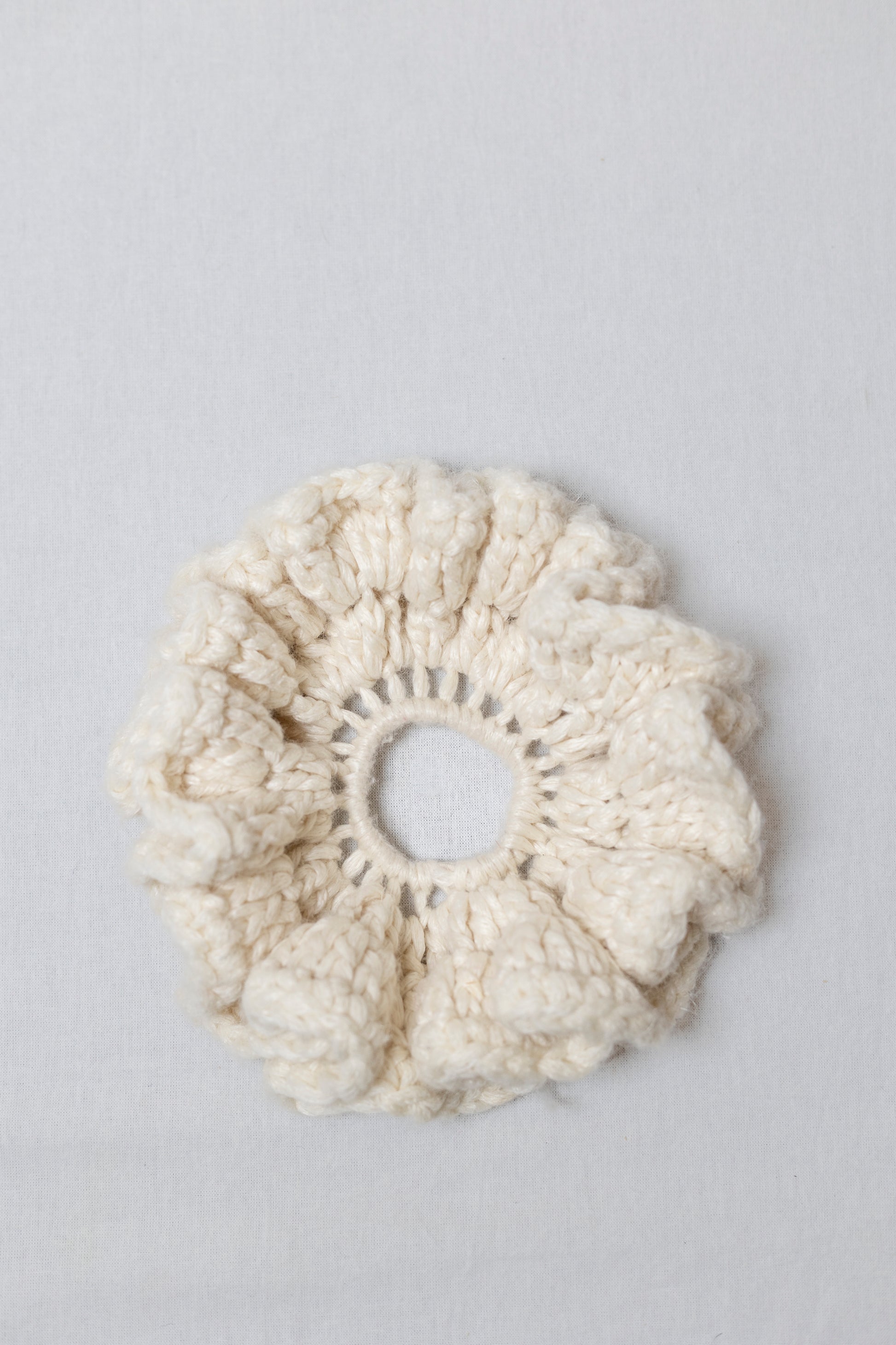 This scrunchie is hand-crocheted from a premium mix of regenerative merino wool from the French Alps and Himalayan nettle provided by a Nepalese social enterprise. Dyed with GOTS-certified colors.